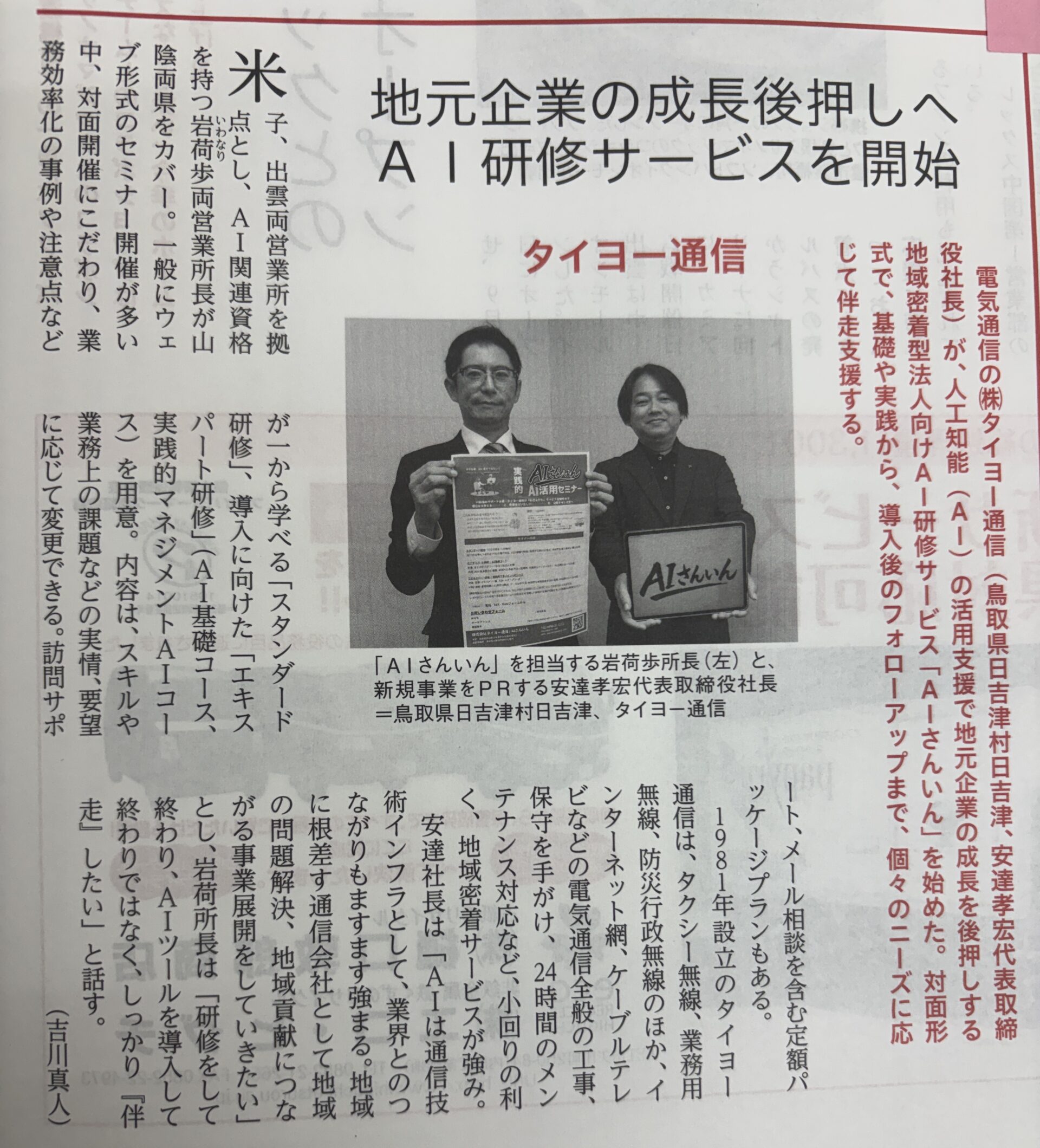 2025年11月4日発行の山陰中央新報社 - 山陰経済ウィークリーにて、 AIさんいんのサービス内容を取材・掲載していただきました。 地域密着型対面サービスとして 山陰地区の企業様のAI活用推進・小回りの利く伴走支援を これからもしっかりと務めさせていただきます。